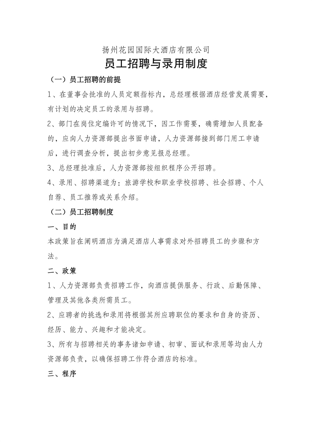 揚(yáng)州花園國(guó)際大酒店有限公司員工招聘與錄用制度2021年